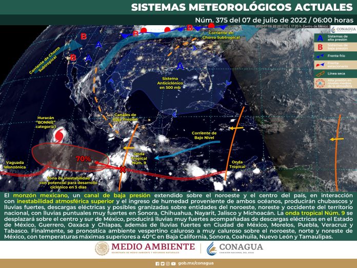 Para este día, el monzón mexicano, un canal de baja presión extendido sobre el noroeste y el centro del país, en interacción con inestabilidad atmosférica superior y el ingreso de humedad proveniente de ambos océanos, producirán chubascos y lluvias fuertes, descargas eléctricas y posibles granizadas sobre entidades del noroeste, noreste y occidente del territorio nacional, con lluvias puntuales muy fuertes en Sonora, Chihuahua, Nayarit, Jalisco y Michoacán. La onda tropical Núm. 9 se desplazará sobre el centro y sur de México, producirá lluvias muy fuertes acompañadas de descargas eléctricas en el Estado de México, Guerrero, Oaxaca y Chiapas, además de lluvias fuertes en Ciudad de México, Morelos, Puebla, Veracruz y Tabasco. Finalmente, se pronostica ambiente vespertino caluroso a muy caluroso sobre el noroeste, norte y noreste de México, con temperaturas máximas superiores a 40°C en Baja California, Sonora, Coahuila, Nuevo León y Tamaulipas.