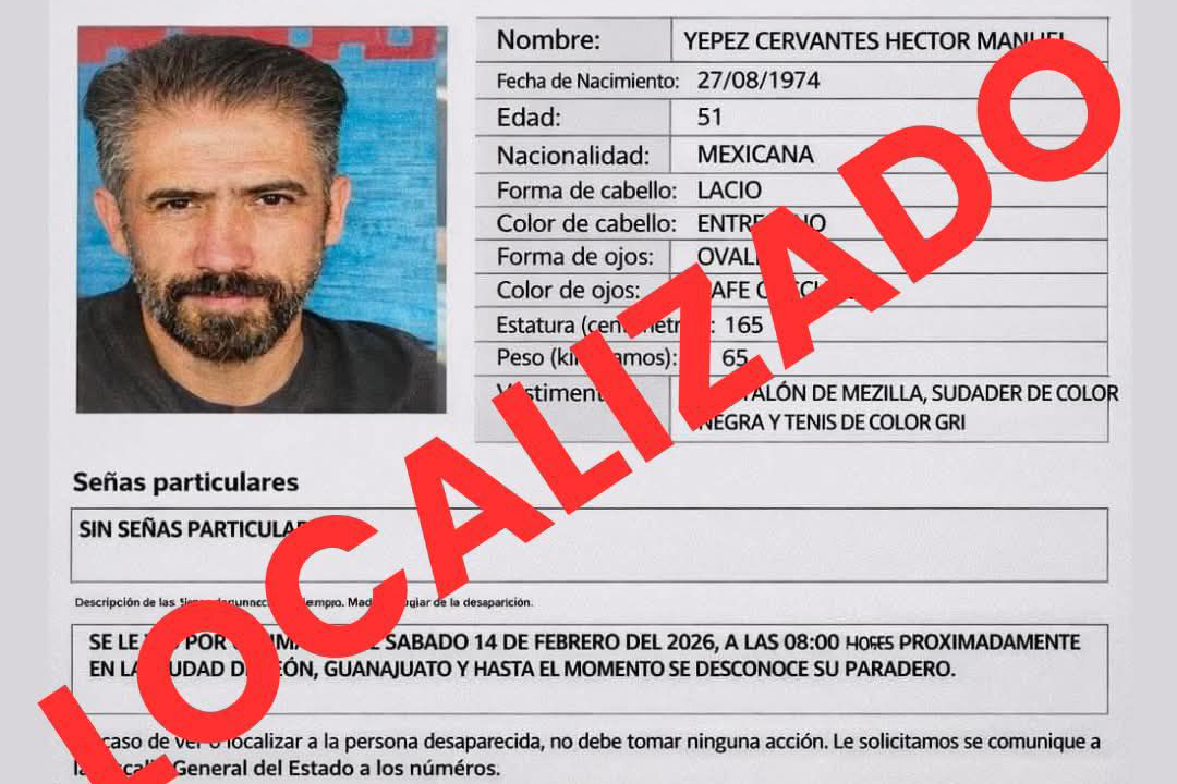 León, Gto., 9 de abril de 2026.- A un mes con tres semanas de su desaparición, el profesor Héctor Manuel Yépez Cervantes fue localizado con vida.