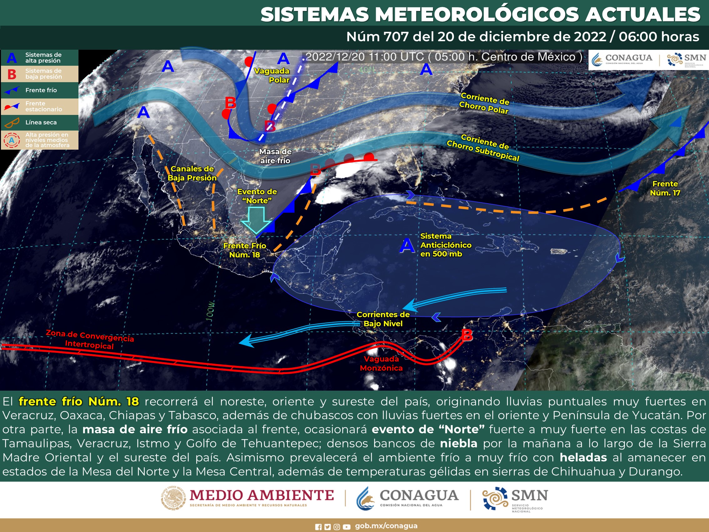 Este día, el frente frío Núm. 18 recorrerá el noreste, oriente y sureste del país, originando lluvias puntuales muy fuertes en Veracruz, Oaxaca, Chiapas y Tabasco, además de chubascos con lluvias fuertes en el oriente y Península de Yucatán. Por otra parte, la masa de aire frío asociada al frente, ocasionará evento de “Norte” fuerte a muy fuerte en las costas de Tamaulipas, Veracruz, Istmo y Golfo de Tehuantepec; densos bancos de niebla por la mañana a lo largo de la Sierra Madre Oriental y el sureste del país. Asimismo, prevalecerá el ambiente frío a muy frío con heladas al amanecer en estados de la Mesa del Norte y la Mesa Central, además de temperaturas gélidas en sierras de Chihuahua y Durango.