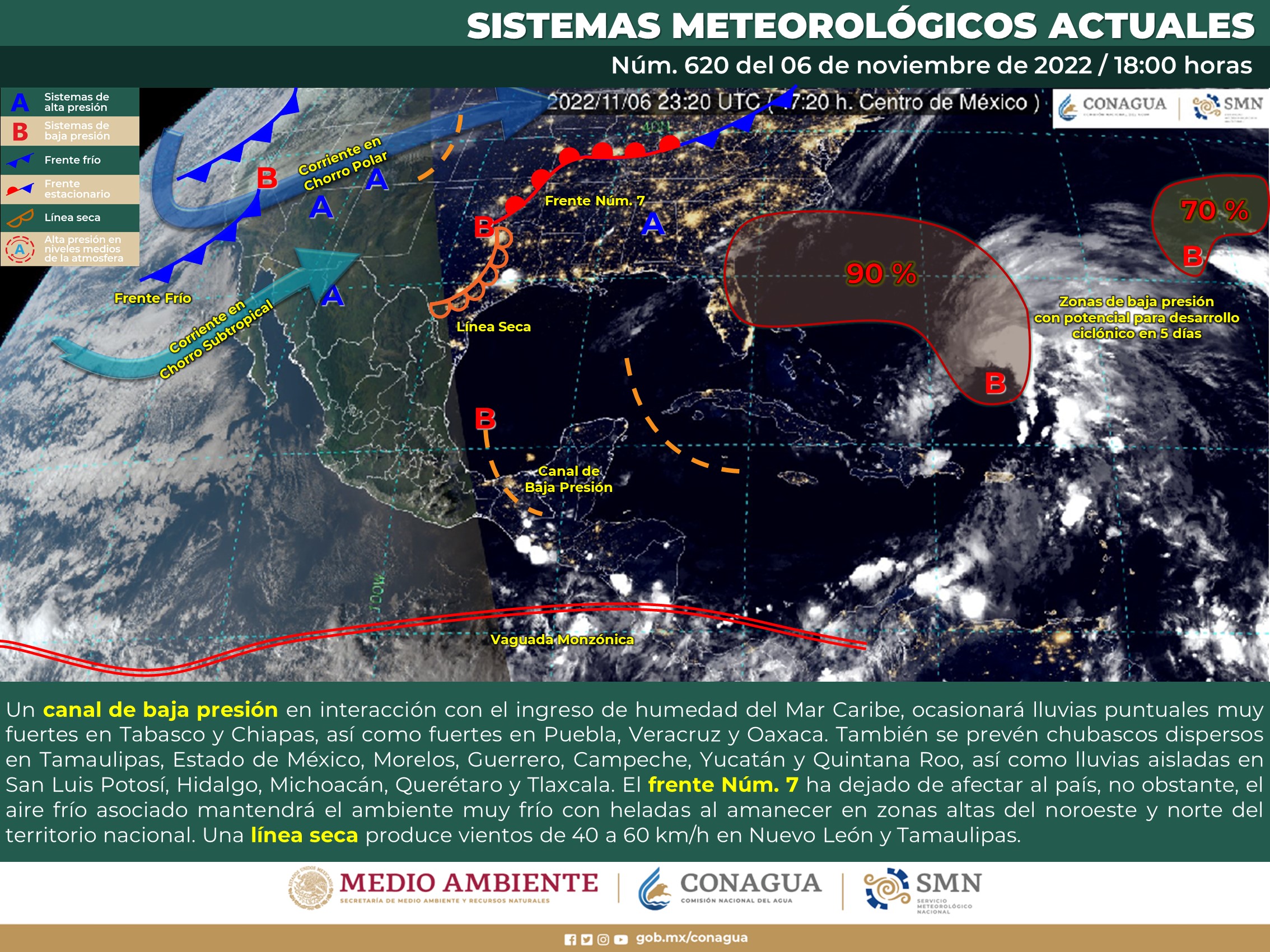 Este día, un canal de baja presión se extenderá sobre el suroeste del Golfo de México y sureste mexicano, interaccionará con el ingreso de humedad del Mar Caribe, ocasionando lluvias puntuales muy fuertes en Tabasco y Chiapas, así como fuertes en Puebla, Veracruz y Oaxaca. La entrada de humedad de ambos litorales ocasionará chubascos dispersos en Tamaulipas, Estado de México, Morelos, Guerrero, Campeche, Yucatán y Quintana Roo, y lluvias aisladas en San Luis Potosí, Hidalgo, Michoacán, Querétaro y Tlaxcala. El frente Núm. 7 ha dejado de afectar al país, no obstante, el aire frío asociado mantendrá el ambiente muy frío con heladas al amanecer en zonas altas del noroeste y norte del territorio nacional. Una línea seca produce vientos de 40 a 60 km/h en Nuevo León y Tamaulipas.