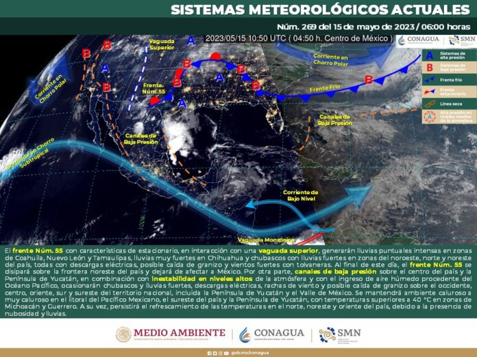 Este día, el frente Núm. 55 con características de estacionario, en interacción con una vaguada superior, generarán lluvias puntuales intensas en zonas de Coahuila, Nuevo León y Tamaulipas, lluvias muy fuertes en Chihuahua y chubascos con lluvias fuertes en zonas del noroeste, norte y noreste del país, todas con descargas eléctricas, posible caída de granizo y vientos fuertes con tolvaneras. Al final de este día, el frente Núm. 55 se disipará sobre la frontera noreste del país y dejará de afectar a México. Por otra parte, canales de baja presión sobre el centro del país y la Península de Yucatán, en combinación con inestabilidad en niveles altos de la atmósfera y con el ingreso de aire húmedo procedente del Océano Pacífico, ocasionarán chubascos y lluvias fuertes, descargas eléctricas, rachas de viento y posible caída de granizo sobre el occidente, centro, oriente, sur y sureste del territorio nacional, incluida la Península de Yucatán y el Valle de México. Se mantendrá ambiente caluroso a muy caluroso en el litoral del Pacífico Mexicano, el sureste del país y la Península de Yucatán, con temperaturas superiores a 40 °C en zonas de Michoacán y Guerrero. A su vez, persistirá el refrescamiento de las temperaturas en el norte, noreste y oriente del país, debido a la presencia de nubosidad y lluvias.