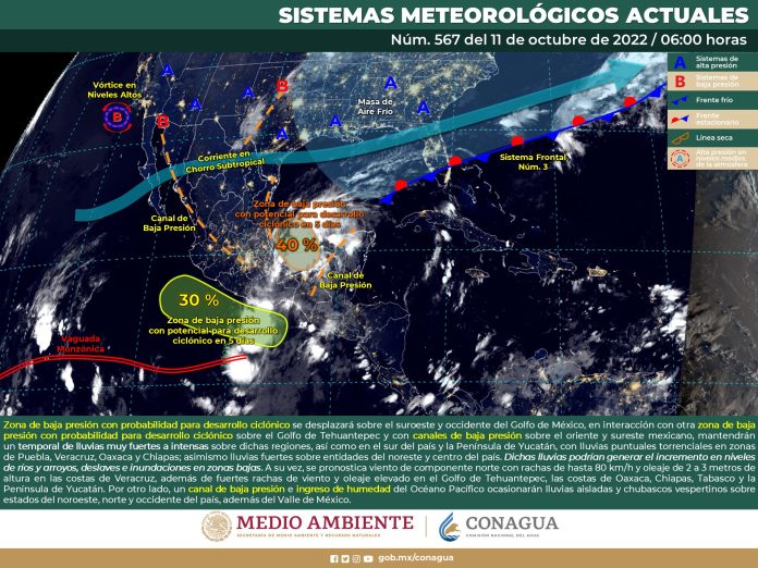Zona de baja presión con probabilidad para desarrollo ciclónico se desplazará sobre el suroeste y occidente del Golfo de México, en interacción con otra zona de baja presión con probabilidad para desarrollo ciclónico sobre el Golfo de Tehuantepec y con canales de baja presión sobre el oriente y sureste mexicano, mantendrán un temporal de lluvias muy fuertes a intensas sobre dichas regiones, así como en el sur del país y la Península de Yucatán, con lluvias puntuales torrenciales en zonas de Puebla, Veracruz, Oaxaca y Chiapas; asimismo lluvias fuertes sobre entidades del noreste y centro del país. Dichas lluvias podrían generar el incremento en niveles de ríos y arroyos, deslaves e inundaciones en zonas bajas. A su vez, se pronostica viento de componente norte con rachas de hasta 80 km/h y oleaje de 2 a 3 metros de altura en las costas de Veracruz, además de fuertes rachas de viento y oleaje elevado en el Golfo de Tehuantepec, las costas de Oaxaca, Chiapas, Tabasco y la Península de Yucatán. Por otro lado, un canal de baja presión e ingreso de humedad del Océano Pacífico ocasionarán lluvias aisladas y chubascos vespertinos sobre estados del noroeste, norte y occidente del país, además del Valle de México. Finalmente, durante la mañana predominará ambiente frío a muy frío sobre entidades de la Mesa del Norte y Mesa Central, con posibles heladas en zonas montañosas. En contraste, se prevé ambiente vespertino cálido a caluroso con temperaturas de 35 a 40°C en la Península de Baja California, el noroeste del país y los estados del litoral del Océano Pacífico.