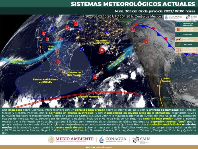 Este día, una línea seca sobre Coahuila, interaccionará con un canal de baja presión sobre el interior del país, con la entrada de humedad del Golfo de México y Océano Pacífico, con la corriente en chorro subtropical y con inestabilidad en niveles altos de la atmósfera, originando lluvias puntuales fuertes y rachas de viento fuertes en zonas de Coahuila, Nuevo León y Tamaulipas; además de lluvias con intervalos de chubascos en estados del noreste, norte, centro y sur del territorio nacional, incluido el Valle de México. Un segundo canal de baja presión sobre el sureste mexicano y la Península de Yucatán, ocasionará lluvias con intervalos de chubascos en dichas regiones. La depresión tropical “Dos”, podría generar rachas de viento de 50 a 70 km/h con oleaje elevado en las costas de Yucatán y Quintana Roo. Finalmente, una circulación anticiclónica en niveles medios de la atmósfera, mantendrá la tercera onda de calor sobre la mayor parte de la República Mexicana, con temperaturas máximas de 40 a 45 °C en zonas de Sinaloa, Nayarit, Jalisco, Colima, Michoacán, Guerrero, Oaxaca, Chiapas, Veracruz, Tabasco, Campeche, Yucatán y Quintana Roo.