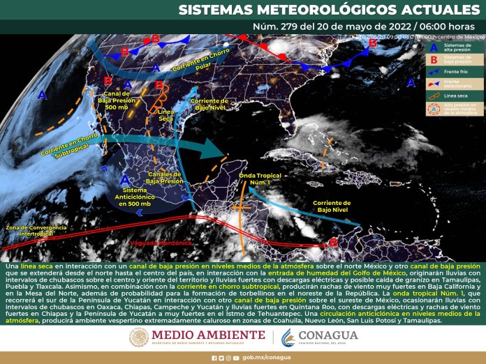 Para hoy, una línea seca en interacción con un canal de baja presión en niveles medios de la atmósfera sobre el norte México y otro canal de baja presión que se extenderá desde el norte hasta el centro del país, en interacción con la entrada de humedad del Golfo de México, originarán lluvias con intervalos de chubascos sobre el noreste, centro y oriente del territorio y lluvias puntuales fuertes con descargas eléctricas y posible caída de granizo en Tamaulipas, Puebla y Tlaxcala. Asimismo, en combinación con la corriente en chorro subtropical, producirán rachas de viento muy fuertes con tolvaneras en Baja California y estados de la Mesa del Norte, además de probabilidad para la formación de torbellinos en Coahuila (noreste), Nuevo León (norte) y Tamaulipas (noroeste). Por su parte, la onda tropical Núm. 1, la cual recorrerá el sur de la Península de Yucatán en interacción con otro canal de baja presión sobre el sureste de México, ocasionarán lluvias con intervalos de chubascos en Oaxaca, Chiapas, Campeche y Yucatán y lluvias puntuales fuertes en Quintana Roo, todas acompañadas de descargas eléctricas, así como rachas de viento fuertes en zonas de Chiapas y de la Península de Yucatán a muy fuertes en el Istmo de Tehuantepec. Finalmente, una circulación anticiclónica en niveles medios de la atmósfera, mantendrá el ambiente vespertino caluroso a muy caluroso en gran parte de la República Mexicana, con temperaturas que pueden superar los 45°C en zonas de Coahuila, Nuevo León, San Luis Potosí y Tamaulipas.
