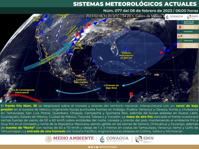 Hoy el frente frío Núm. 30 se desplazará sobre el noreste y oriente del territorio nacional, interaccionará con un canal de baja presión que se extenderá sobre el sureste de México, originando lluvias puntuales fuertes en Hidalgo, Puebla, Veracruz y Oaxaca, lluvias y chubascos en Tamaulipas, San Luis Potosí, Querétaro, Chiapas, Estado de México, Ciudad de México, Tlaxcala, Campeche y Quintana Roo, además de lluvias aisladas en Nuevo León, Guanajuato, Morelos, Tabasco y Yucatán. La masa de aire frío asociada al frente ocasionará rachas fuertes de viento de 50 a 60 km/h sobre entidades del norte, noreste y oriente del país, manteniendo el ambiente frío a muy frío en el noroeste y norte de la República Mexicana, siendo gélido en las sierras de Sonora, Chihuahua y Durango, además de evento de “Norte” con rachas de 60 a 70 km/h y oleaje elevado de 1 a 3 metros en costas de Tamaulipas, Veracruz, Istmo y Golfo de Tehuantepec. Por otra parte, la entrada de aire húmedo del Océano Pacífico, originará lluvias aisladas en Colima, Jalisco y Michoacán. Finalmente, se mantendrá ambiente cálido a caluroso en los estados costeros del Pacífico Centro y Sur.