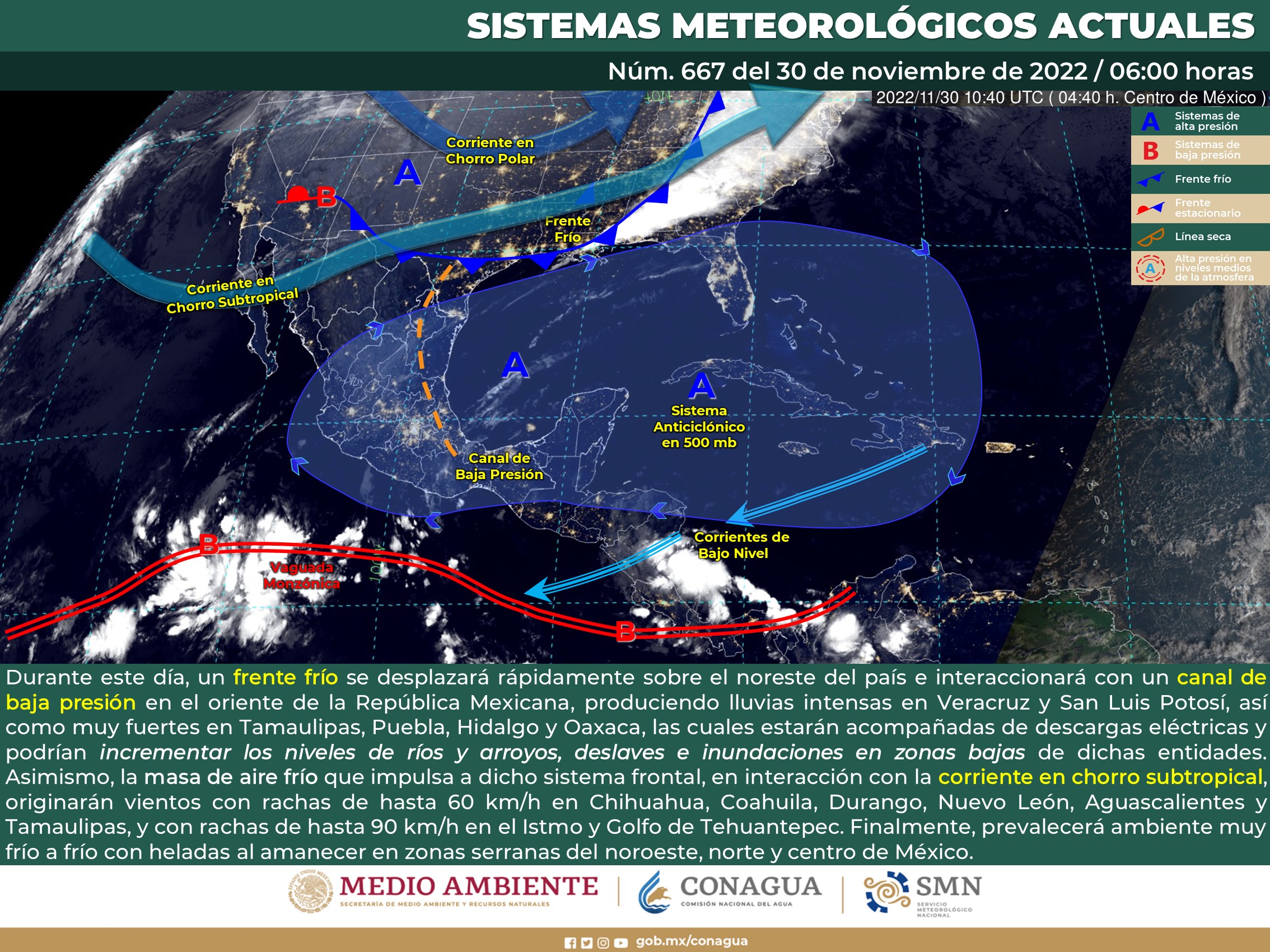 Durante este día, un frente frío se desplazará rápidamente sobre el noreste del país e interaccionará con un canal de baja presión en el oriente de la República Mexicana, produciendo lluvias intensas en Veracruz y San Luis Potosí, así como muy fuertes en Tamaulipas, Puebla, Hidalgo y Oaxaca, las cuales estarán acompañadas de descargas eléctricas y podrían incrementar los niveles de ríos y arroyos, deslaves e inundaciones en zonas bajas de dichas entidades. Asimismo, la masa de aire frío que impulsa al frente, en interacción con la corriente en chorro subtropical, originarán vientos con rachas de hasta 60 km/h en Chihuahua, Coahuila, Durango, Nuevo León, Aguascalientes y Tamaulipas; con rachas de hasta 90 km/h en el Istmo y Golfo de Tehuantepec. Por otra parte, el ingreso de humedad proveniente del Océano Pacífico, Golfo de México y Mar Caribe, propiciarán lluvias y chubascos en el occidente, centro, sur y sureste del país, además de la Península de Yucatán, con lluvias puntuales fuertes en Querétaro, Guerrero, Chiapas y Tabasco. Finalmente, prevalecerá ambiente muy frío a frío con heladas al amanecer en zonas serranas del noroeste, norte y centro de México.