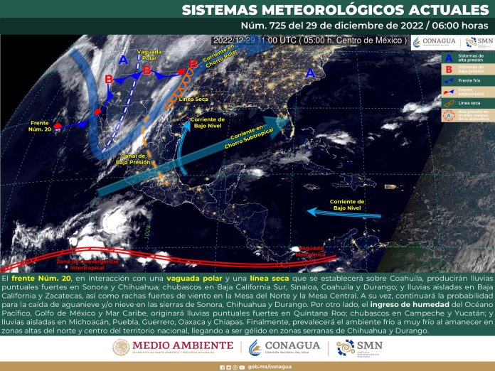 Mesa del Norte: Cielo medio nublado a nublado con probabilidad de lluvias fuertes en Chihuahua; chubascos en Coahuila y Durango; y lluvias aisladas en Zacatecas. En el resto de la región cielo con nubosidad dispersa y sin lluvia. Ambiente matutino frío, y muy frío con heladas sobre sierras, además de gélido con heladas y posible caída de aguanieve y/o nieve en zonas serranas de Chihuahua y Durango. Ambiente vespertino fresco a templado, y cálido en San Luis Potosí. Viento de dirección variable de 15 a 30 km/h en la región, con rachas de 60 a 70 km/h con tolvaneras en Chihuahua y Durango; así como rachas de 50 a 60 km/h en Coahuila, Zacatecas y San Luis Potosí, acompañadas de tolvaneras en Nuevo León y Aguascalientes.