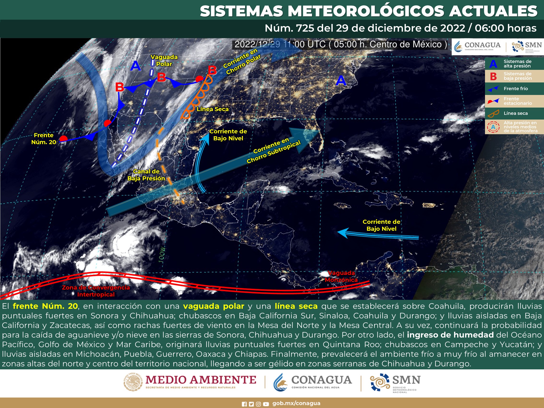 Península de Baja California: Cielo medio nublado a nublado la mayor parte del día. Ambiente matutino fresco, y frío a muy frío con heladas al amanecer en zonas serranas. Por la tarde, ambiente templado con probabilidad de chubascos en Baja California Sur y lluvias aisladas en Baja California. Viento de dirección variable de 20 a 30 km/h en la región, con rachas de 40 km/h en el norte del Golfo de California. Oleaje de 2 a 3 metros de altura en la costa occidental de Baja California.