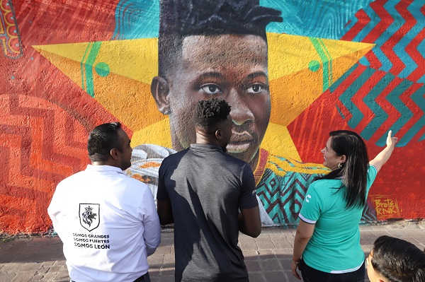 León, Gto., 17 de junio de 2024.- El futbolista camerunés André Onana, estuvo como invitado en la develación de un mural que se pintó en su honor en una barda de 15 metros del bulevar Adolfo López Mateos.
