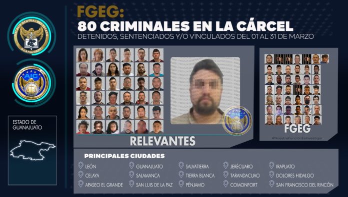 Guanajuato, 1 de abril de 2022.- Al cierre del mes de marzo, la Fiscalía General del Estado intervino en la detención de 80 infractores relevantes, quienes fueron presentados ante el Juez como presuntos responsables de varios delitos del fuero común. Entre los detenidos figuran casos que impactaron a la sociedad y que derivaron en la detención de los responsables, como es el caso de JULIO CÉSAR “N” alias “La Gringa”, quien intervino en la desaparición de la Maestra Lupita, en Salvatierra. El secuestro de un adolescente y un adulto, en Irapuato, cuyo responsable es JOSÉ IGNACIO “N”, que ha sido sentenciado a 70 años de cárcel.