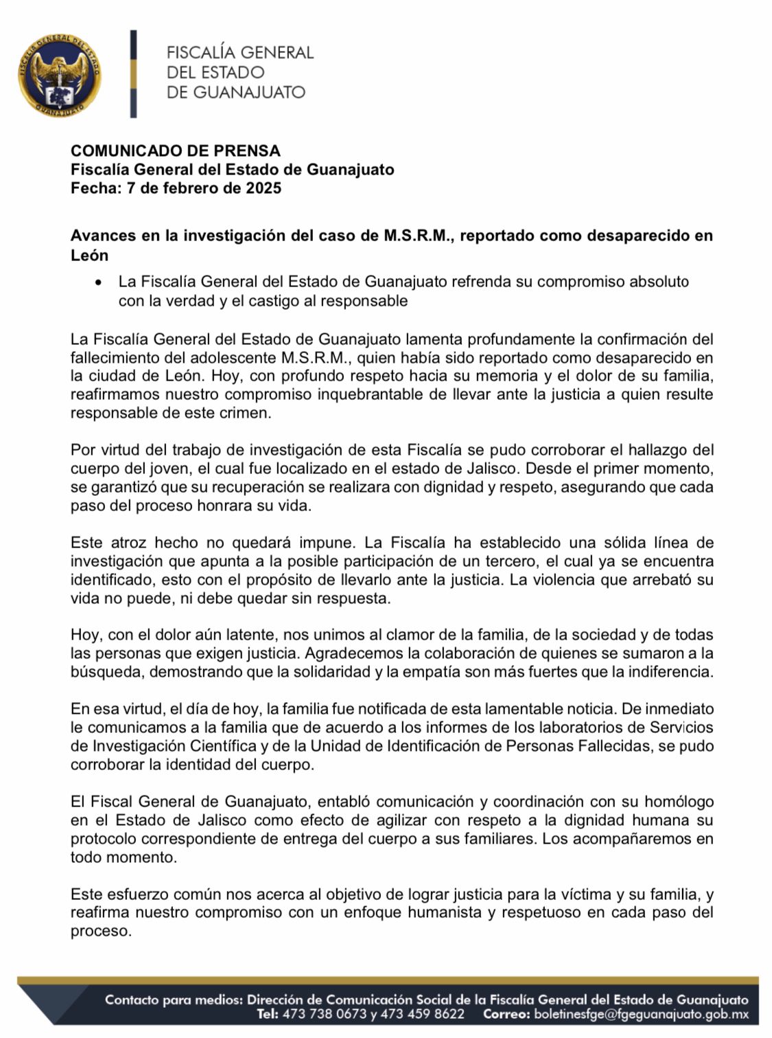 Guanajuato, Gto., 7 de febrero de 2025.- La Fiscalía de Guanajuato confirmó el hallazgo sin vida del joven Mateo Santiago cuya desaparición logró mover no sólo a cientos de leoneses sino los corazones de miles de personas quienes siguieron el proceso de su búsqueda.