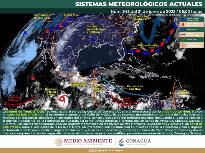 Para hoy, el ciclón tropical “Celia” se desplazará al sur de las costas de Oaxaca y Guerrero y continuará interactuando con la onda tropical Núm. 6 que recorrerá el sureste del país y con un canal de baja presión extendido sobre el occidente y suroeste del Golfo de México. Estos sistemas mantendrán el temporal de lluvias puntuales fuertes a intensas acompañadas de descargas eléctricas sobre entidades del oriente, centro y occidente del territorio nacional, incluyendo al Valle de México y al oriente y occidente de la Península de Yucatán, así como lluvias intensas a puntuales torrenciales en zonas de Veracruz, Chiapas, Oaxaca y Guerrero. Las lluvias mencionadas podrían originar incremento en los niveles de ríos y arroyos, inundaciones y deslaves. Por otra parte, un canal de baja presión sobre el occidente de la Mesa del Norte, en interacción con inestabilidad en niveles altos de la atmósfera y con el ingreso de humedad del Océano Pacífico, originarán lluvias puntuales muy fuertes con posibles granizadas en zonas de Chihuahua; chubascos y lluvias puntuales fuertes acompañados de descargas eléctricas en el noroeste del país, con posibles granizadas en zonas de Sonora, Durango y Sinaloa. Finalmente, una circulación anticiclónica en niveles medios de la atmósfera sobre el sur de Estados Unidos, mantendrá el ambiente vespertino cálido a caluroso en la mayor parte del territorio nacional, con temperaturas máximas muy calurosas, superiores a 40°C en Baja California, Sonora, Sinaloa, Coahuila, Nuevo León y Tamaulipas.