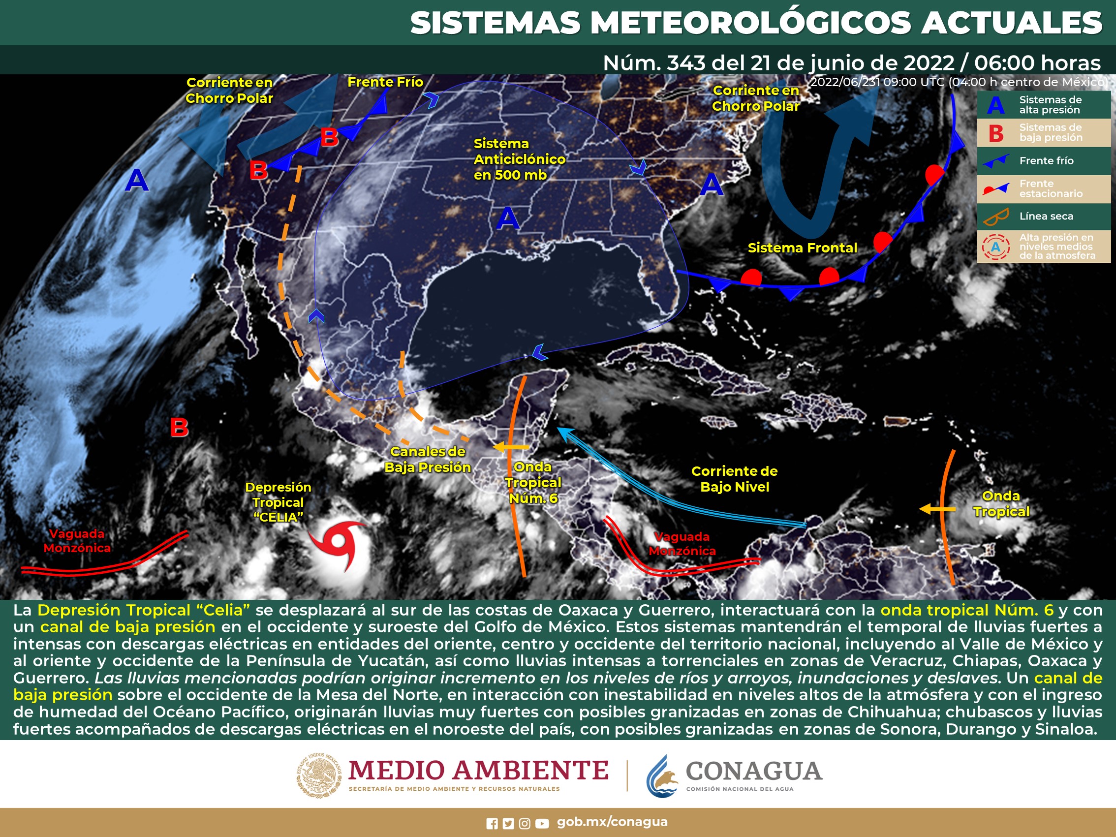 Para mayor información de la Depresión Tropical “Celia” del Océano Pacífico, consultar los avisos del Servicio Meteorológico Nacional (SMN), a través de: