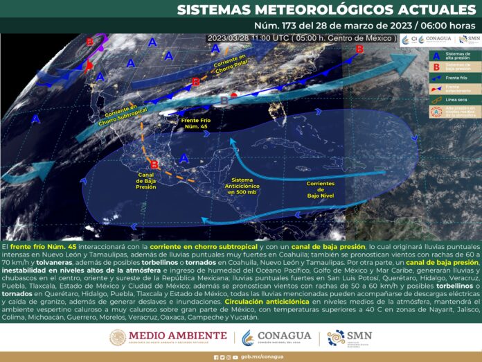 Este día, el frente frío Núm. 45 se localizará sobre el noreste del país e interaccionará con la corriente en chorro subtropical y con un canal de baja presión, los cuales originarán lluvias puntuales intensas en Nuevo León y Tamaulipas, así como lluvias puntuales muy fuertes en Coahuila; además se pronostican vientos con rachas de 60 a 70 km/h y tolvaneras, así como posible formación de torbellinos o tornados en Coahuila, Nuevo León y Tamaulipas. Por otra parte, un canal de baja presión, inestabilidad en niveles altos de la atmósfera e ingreso de humedad del Océano Pacífico, Golfo de México y Mar Caribe, generarán lluvias y chubascos en el centro, oriente y sureste de la República Mexicana; lluvias puntuales fuertes en San Luis Potosí, Querétaro, Hidalgo, Veracruz, Puebla, Tlaxcala, Estado de México y Ciudad de México; además se pronostican vientos con rachas de 50 a 60 km/h con posible formación de torbellinos o tornados en Querétaro, Hidalgo, Puebla, Tlaxcala y Estado de México, todas las lluvias mencionadas pueden acompañarse de descargas eléctricas y caída de granizo. Finalmente, una circulación anticiclónica en niveles medios de la atmósfera, mantendrá el ambiente vespertino caluroso a muy caluroso sobre gran parte de México, con temperaturas superiores a 40 °C en zonas de Nayarit, Jalisco, Colima, Michoacán, Guerrero, Morelos, Veracruz, Oaxaca, Campeche y Yucatán.