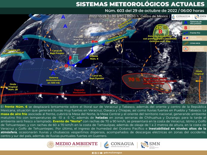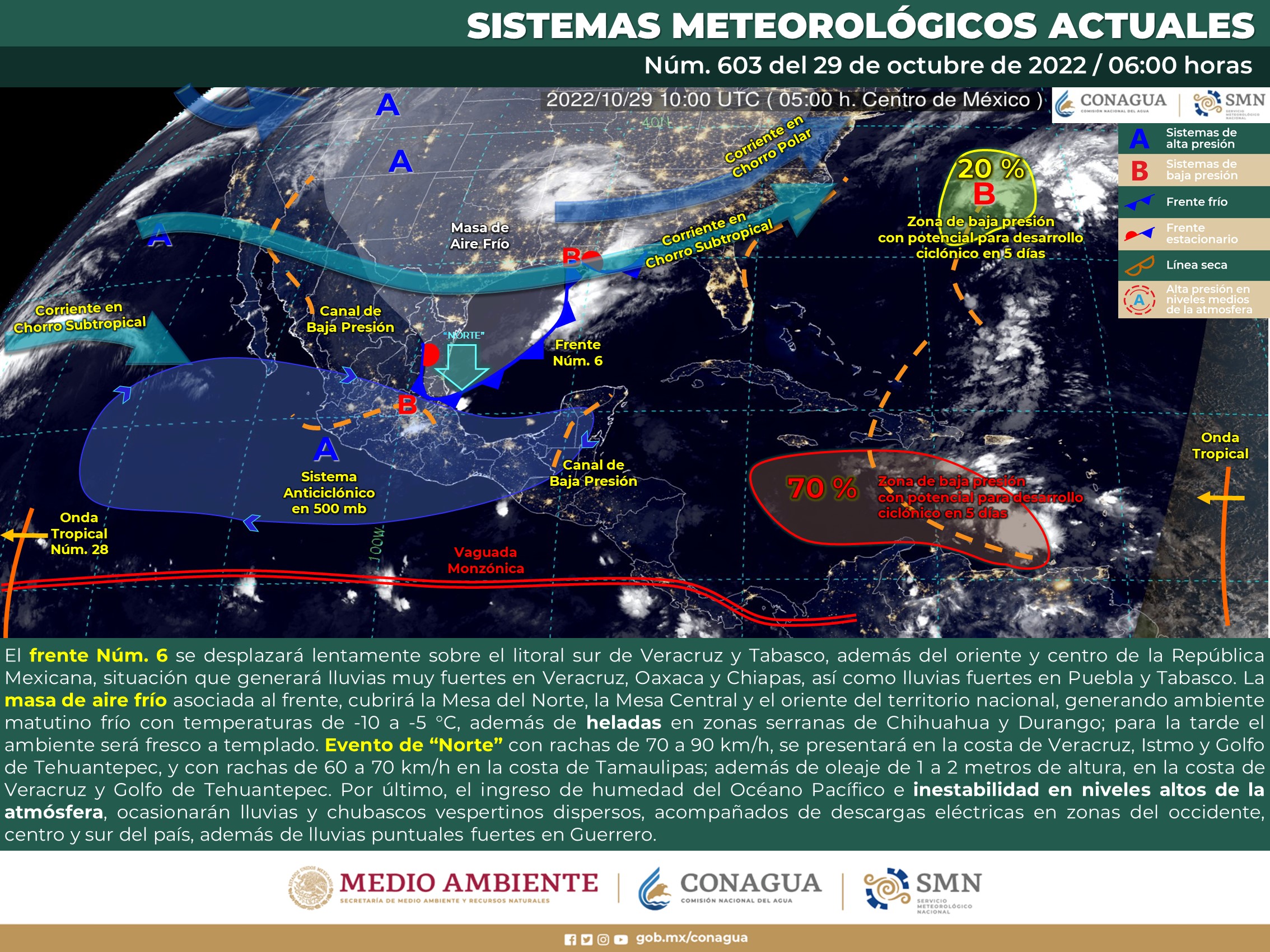 Este día, el frente Núm. 6 se desplazará lentamente sobre el litoral sur de Veracruz y Tabasco, además del oriente y centro de la República Mexicana, situación que generará lluvias muy fuertes en Veracruz, Oaxaca y Chiapas, así como lluvias fuertes en Puebla y Tabasco. La masa de aire frío asociada al frente, cubrirá la Mesa del Norte, la Mesa Central y el oriente del territorio nacional, generando ambiente matutino frío con temperaturas de -10 a -5 °C, además de heladas en zonas serranas de Chihuahua y Durango; para la tarde el ambiente será fresco a templado. Evento de “Norte” con rachas de 70 a 90 km/h, se presentará en la costa de Veracruz, Istmo y Golfo de Tehuantepec, y con rachas de 60 a 70 km/h en la costa de Tamaulipas; además de oleaje de 1 a 2 metros de altura, en la costa de Veracruz y Golfo de Tehuantepec. Por último, el ingreso de humedad del Océano Pacífico e inestabilidad en niveles altos de la atmósfera, ocasionarán lluvias y chubascos vespertinos dispersos, acompañados de descargas eléctricas en zonas del occidente, centro y sur del país, además de lluvias puntuales fuertes en Guerrero.