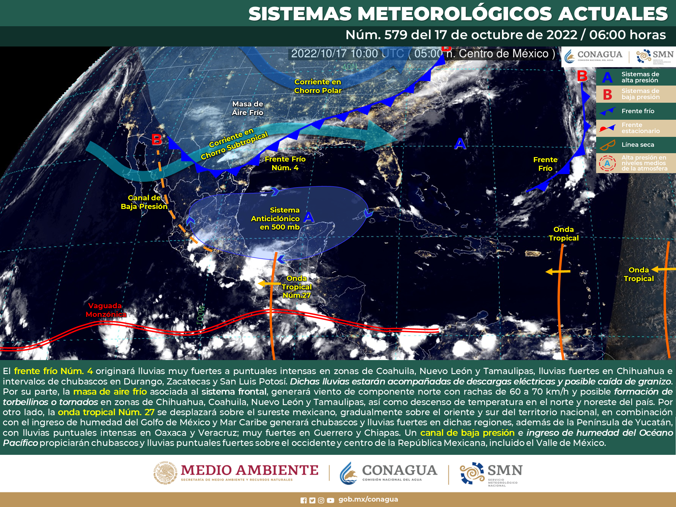 Este día, el frente frío Núm. 4 se desplazará sobre el norte y noreste de la República Mexicana, originando lluvias muy fuertes a puntuales intensas en zonas de Coahuila, Nuevo León y Tamaulipas, lluvias fuertes en Chihuahua e intervalos de chubascos en Durango, Zacatecas y San Luis Potosí. Dichas lluvias estarán acompañadas de descargas eléctricas y posible caída de granizo. Por su parte, la masa de aire frío asociada al sistema frontal, generará viento de componente norte con rachas de 60 a 70 km/h y posible formación de torbellinos o tornados en zonas de Chihuahua, Coahuila, Nuevo León y Tamaulipas, así como descenso de temperatura en el norte y noreste del país. Por otro lado, la onda tropical Núm. 27 se desplazará sobre el sureste mexicano, gradualmente sobre el oriente y sur del territorio nacional, en combinación con el ingreso de humedad del Golfo de México y Mar Caribe generará chubascos y lluvias fuertes en las regiones mencionadas, además de la Península de Yucatán, con lluvias puntuales intensas en Oaxaca y Veracruz; muy fuertes en Guerrero y Chiapas. Asimismo, un canal de baja presión sobre el occidente y centro de la República Mexicana e ingreso de humedad del Océano Pacífico propiciarán chubascos y lluvias puntuales fuertes en dichas regiones, incluido el Valle de México. Finalmente, una circulación anticiclónica en niveles medios de la atmósfera ocasionará temperaturas vespertinas cálidas a calurosas sobre la Península de Yucatán y estados del noroeste y occidente de la República Mexicana.