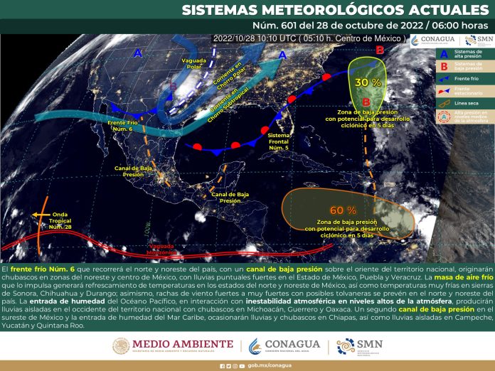 Para hoy, el frente frío Núm. 6 que recorrerá el norte y noreste del país e interaccionará con un canal de baja presión sobre el oriente del territorio nacional, originará chubascos en zonas del noreste y centro de México, con lluvias puntuales fuertes en el Estado de México, Puebla y Veracruz. La masa de aire frío que lo impulsa generará refrescamiento de temperaturas en los estados del norte y noreste de México, así como temperaturas muy frías en sierras de Sonora, Chihuahua y Durango; asimismo, rachas de viento fuertes a muy fuertes con posibles tolvaneras se prevén en el norte y noreste del país. La entrada de humedad del Océano Pacífico, en interacción con inestabilidad atmosférica en niveles altos de la atmósfera, producirán lluvias aisladas en el occidente del territorio nacional con chubascos en Michoacán, Guerrero y Oaxaca. Dichas lluvias estarán acompañadas de descargas eléctricas, rachas de viento y posible caída de granizo. Por su parte, un segundo canal de baja presión en el sureste de México y la entrada de humedad del Mar Caribe, ocasionarán lluvias y chubascos en Chiapas, así como lluvias aisladas en Campeche, Yucatán y Quintana Roo. En contraste, ambiente cálido vespertino prevalecerá con temperaturas superiores a los 35 °C, en zonas de Sinaloa, Michoacán, Guerrero, Chiapas, Campeche y Yucatán.