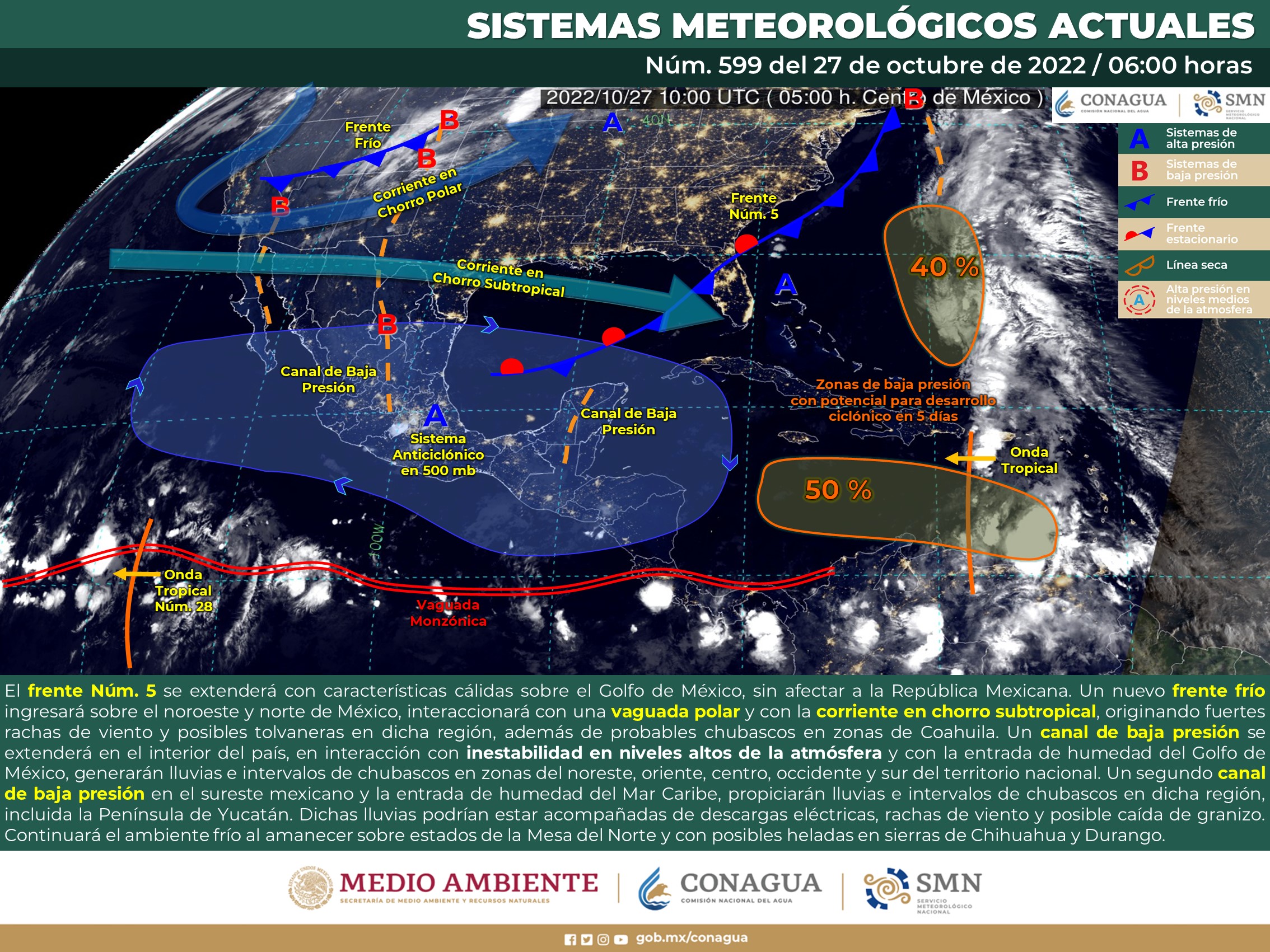 Este día, el frente Núm. 5 se extenderá con características cálidas sobre el Golfo de México, sin afectar a la República Mexicana. Por otra parte, un nuevo frente frío ingresará sobre el noroeste y norte de México, interaccionará con una vaguada polar y con la corriente en chorro subtropical, originando fuertes rachas de viento y posibles tolvaneras en dicha región, además de probables chubascos en zonas de Coahuila. Por otra parte, un canal de baja presión se extenderá en el interior del país, en interacción con inestabilidad en niveles altos de la atmósfera y con la entrada de humedad del Golfo de México, generarán lluvias e intervalos de chubascos en zonas del noreste, oriente, centro, occidente y sur del territorio nacional. Un segundo canal de baja presión en el sureste mexicano y la entrada de humedad del Mar Caribe, propiciarán lluvias e intervalos de chubascos en dicha región, incluida la Península de Yucatán. Dichas lluvias podrían estar acompañadas de descargas eléctricas, rachas de viento y posible caída de granizo. Finalmente continuará el ambiente frío al amanecer sobre estados de la Mesa del Norte y con posibles heladas en sierras de Chihuahua y Durango.