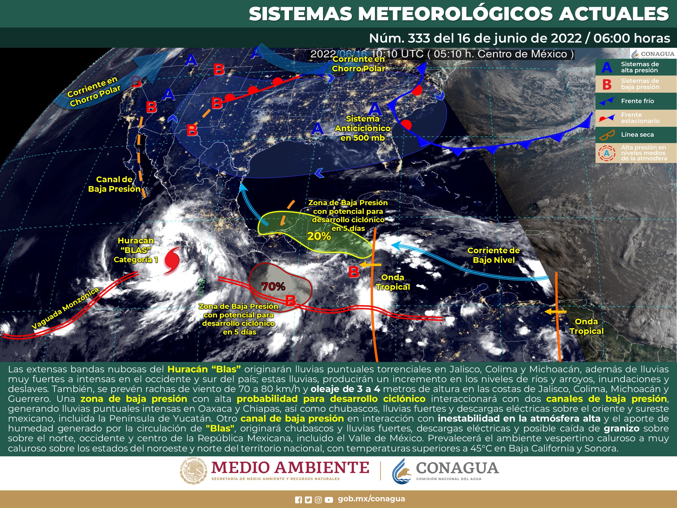 Este día, el Huracán “Blas” se desplazará paralelo a las costas de Michoacán y Colima; sus extensas bandas nubosas originarán lluvias puntuales torrenciales en Jalisco, Colima y Michoacán, además de lluvias muy fuertes a intensas en el occidente y sur del país; estas lluvias, producirán un incremento en los niveles de ríos y arroyos, inundaciones y deslaves. Asimismo, se prevén rachas de viento de 70 a 80 km/h y oleaje de 3 a 4 metros de altura en las costas de Jalisco, Colima, Michoacán y Guerrero. Por otra parte, una zona de baja presión con alta probabilidad para desarrollo ciclónico se localizará al sur de las costas de Chiapas, e interaccionará con dos canales de baja presión en el oriente y sureste mexicano, generando lluvias puntuales intensas en Oaxaca y Chiapas, así como chubascos, lluvias fuertes y descargas eléctricas en las regiones antes mencionadas, incluida la Península de Yucatán. Otro canal de baja presión sobre el norte, occidente y centro de la República Mexicana, en interacción con inestabilidad en la atmósfera alta y el aporte de humedad generado por la circulación de “Blas”, originará chubascos y lluvias fuertes, descargas eléctricas y posible caída de granizo sobre las regiones mencionadas, incluido el Valle de México. También, prevalecerá el ambiente vespertino caluroso a muy caluroso sobre los estados del noroeste y norte del territorio nacional, con temperaturas superiores a 45°C en Baja California y Sonora.