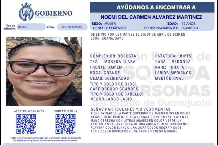 León, Gto., 7 de abril de 2026.- Familiares y colectivos buscan a Noemí del Carmen Álvarez Martínez, desaparecida desde el miércoles primero de abril, en León.