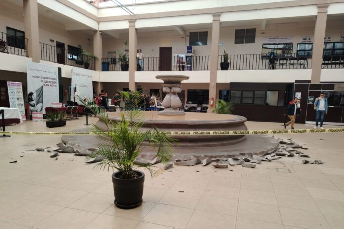Celaya, Gto., 27 de abril de 2026.- Durante las primeras horas de la mañana, un hombre bajo los influjos de alguna sustancia ingresó a la Presidencia Municipal y comenzó a destruir la fuente que se encuentra en el patio interior del inmueble,con un objeto conocido como “Unifila” sin que nadie lo detuviera, pese a que en ese lugar están dos policías municipales permanentes.