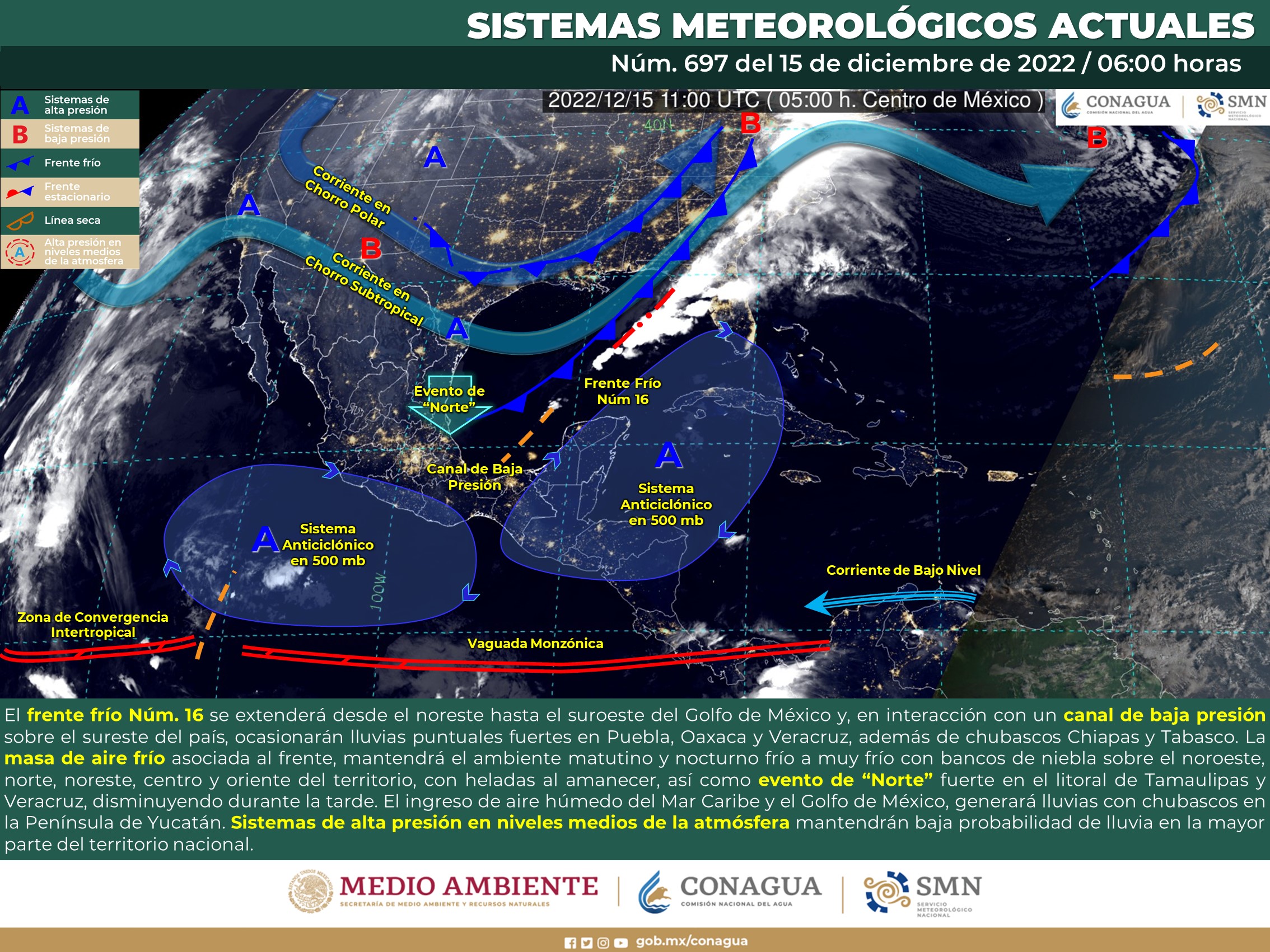 Para hoy, el frente frío Núm. 16 se extenderá desde el noreste hasta el suroeste del Golfo de México y, en interacción con un canal de baja presión sobre el sureste del país, ocasionarán lluvias puntuales fuertes en Puebla, Oaxaca y Veracruz, además de chubascos Chiapas y Tabasco. La masa de aire frío asociada al frente, mantendrá el ambiente matutino y nocturno frío a muy frío con bancos de niebla sobre el noroeste, norte, noreste, centro y oriente del territorio, con heladas al amanecer; así como evento de “Norte” en el litoral de Tamaulipas y Veracruz, disminuyendo durante la tarde. Por su parte, el ingreso de aire húmedo del Mar Caribe y el Golfo de México, generará lluvias con chubascos en la Península de Yucatán. Finalmente, sistemas de alta presión en niveles medios de la atmósfera mantendrán baja probabilidad de lluvia en la mayor parte del territorio nacional.