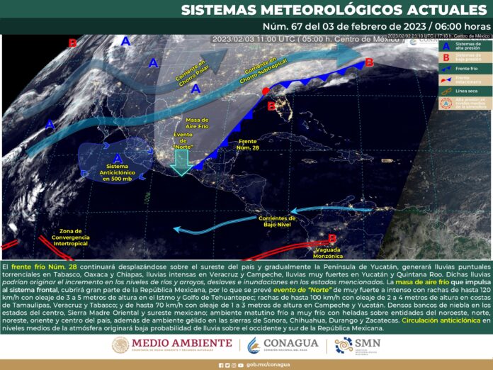Para hoy, el frente frío Núm. 28 continuará desplazándose sobre el sureste del país y gradualmente la Península de Yucatán, generará lluvias puntuales torrenciales en Tabasco, Oaxaca y Chiapas, lluvias intensas en Veracruz y Campeche, lluvias muy fuertes en Yucatán y Quintana Roo. Dichas lluvias podrían originar el incremento en los niveles de ríos y arroyos, deslaves e inundaciones en los estados mencionados. La masa de aire frío que impulsa al sistema frontal, cubrirá gran parte de la República Mexicana, por lo que se prevé evento de “Norte” de muy fuerte a intenso con rachas de hasta 120 km/h con oleaje de 3 a 5 metros de altura en el Istmo y Golfo de Tehuantepec; rachas de hasta 100 km/h con oleaje de 2 a 4 metros de altura en costas de Tamaulipas, Veracruz y Tabasco; y de hasta 70 km/h con oleaje de 1 a 3 metros de altura en Campeche y Yucatán. Así como densos bancos de niebla en los estados del centro, Sierra Madre Oriental y sureste mexicano; ambiente matutino frío a muy frío con heladas sobre entidades del noroeste, norte, noreste, oriente y centro del país, además de ambiente gélido en las sierras de Sonora, Chihuahua, Durango y Zacatecas. Por otro lado, una circulación anticiclónica en niveles medios de la atmósfera originará baja probabilidad de lluvia sobre el occidente y sur de la República Mexicana.