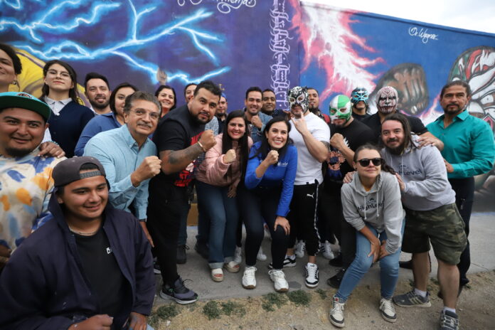 León, Gto., a 19 de mayo de 2023.- El deporte se llevará a todos los rincones de la ciudad, aseguró la alcaldesa Ale Gutiérrez, tras reconocer a los artistas urbanos locales que le dan vida a la ciudad con temáticas como el de la lucha libre, al participar en el evento “De 2 de 3 Caídas”, realizado en la zona de Las Joyas.