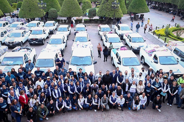Una caravana con cientos de cobijas partió de Presidencia Municipal hacia varias colonias tras el banderazo hecho por la alcaldesa Ale Gutiérrez.