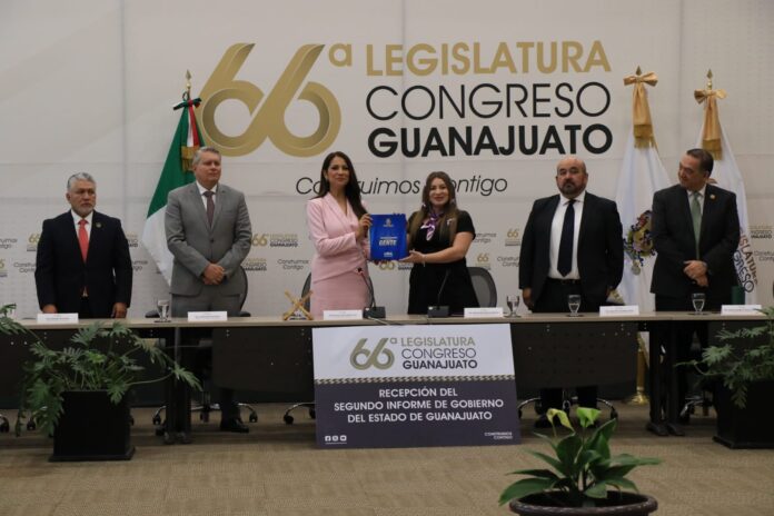 Guanajuato, Gto., 5 de marzo de 2026.- Esta mañana, la diputada Martha Edith Moreno Valencia, presidenta del Congreso del Estado, recibió de manos de la gobernadora del estado, Libia Dennise García Muñoz Ledo, los archivos que contienen el Segundo Informe de Gobierno de la titular del Poder Ejecutivo estatal.