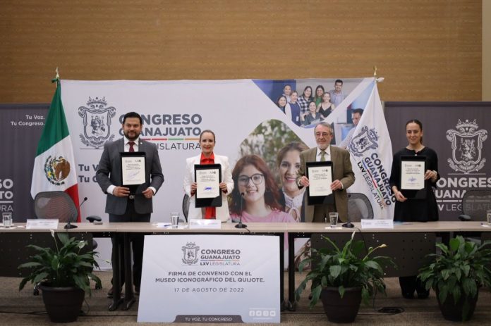 Guanajuato, Gto. a 17 de agosto de 2022.– Con el objeto de continuar impulsando la cultura y crear mecanismos para que las familias se acerquen a las actividades de arte, cultura y educación, el Congreso del Estado de Guanajuato firmó un convenio de colaboración con el Museo Iconográfico del Quijote (MIQ).