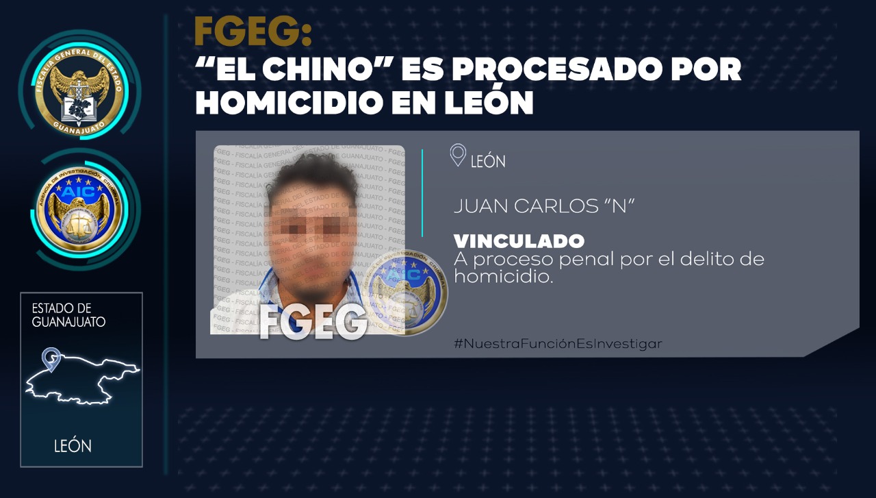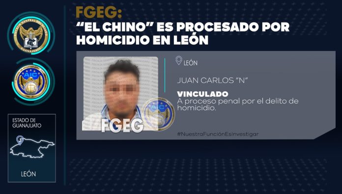 León, Gto., 9 de julio de 2022.- El permanente seguimiento a una investigación que inició en el 2016 por el homicidio de un hombre llamado J. Refugio “N”, llevó a la detención y vinculación a proceso penal de JUAN CARLOS “N” alias “El Chino”, acusado de dispararle al ofendido con un arma de fuego y quitarle la vida cuando se encontraba en una camioneta, en la colonia Uyepac, en León.