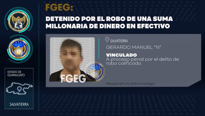 Salvatierr, Gto., 5 de junio de 2022.- Durante el desarrollo de una investigación encabezada por el Ministerio Público y servicios periciales coordinados con analistas de información y Agentes ministeriales, se logró acreditar la probable responsabilidad de un elemento de seguridad privada quien, robó varios millones de pesos de una empresa de valores, en Salvatierra.