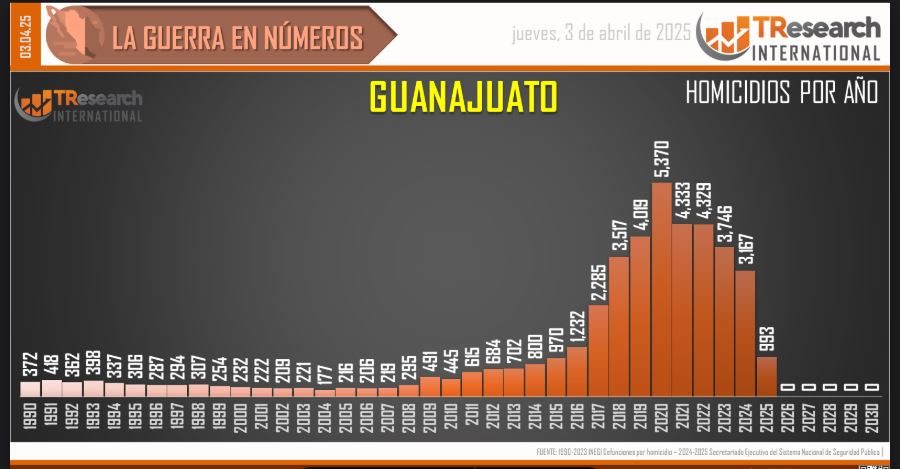 De acuerdo con el repositorio de información de TResearch Internacional de Carlos Penna Charolet liberado este jueves, Guanajuato reporta una disminución del tresd por ciento en homicidios dolosos y comienza a registrar una baja en comparación con las cifras del año pasado.