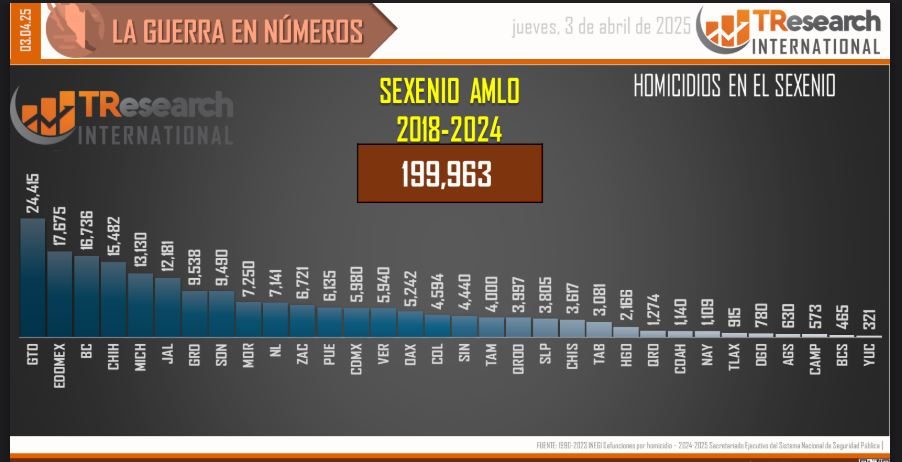 Durante el sexenio anterior, en el país se reportaron 199 mil 963 homicidios en el país de los cuales, 24 mil 415 se registraron en Guanajuato. El segundo lugar fue el Estado de México con 17 mil 675 casos.