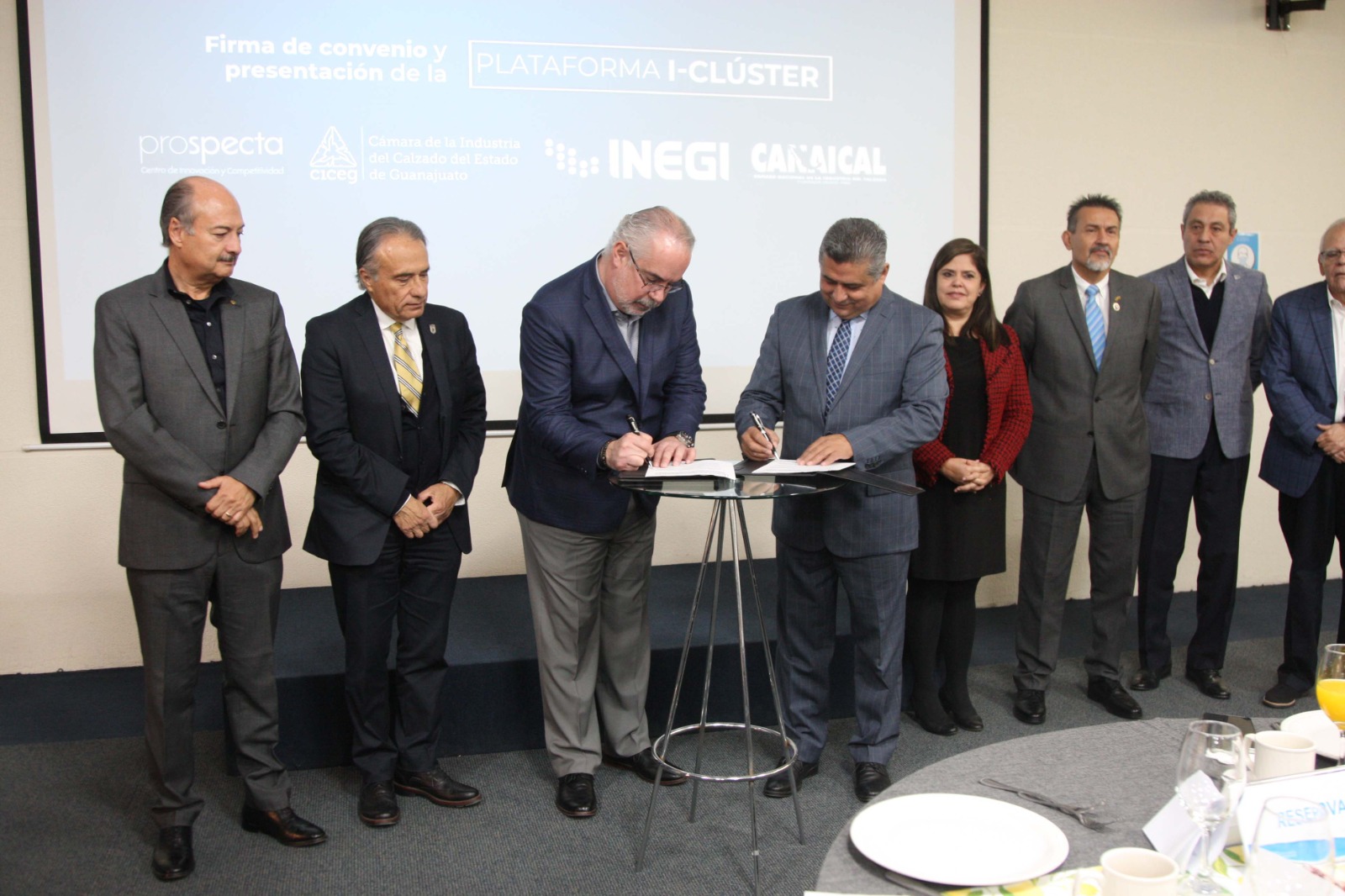 León, Gto., a 15 de febrero de 2023.- Ante socios y agremiados de la cadena Proveeduría-Cuero-Calzado, se llevó a cabo la firma de un convenio de colaboración entre el Instituto Nacional de Estadística, Geografía e Informática (INEGI) y la Cámara de la Industria del Calzado del Estado de Guanajuato (CICEG), la razón principal fue unir esfuerzos para fortalecer la difusión de la información y simplificar el uso de las diversas plataformas tecnológicas con que cuenta el INEGI como la plataforma I-Clúster.