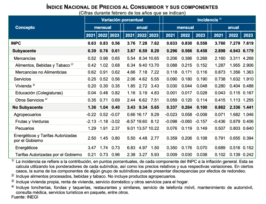 En febrero de 2023, el Índice Nacional de Precios al Consumidor (INPC) registró una variación de 0.56 % con respecto al mes anterior. Con este resultado, la inflación general anual se ubicó en 7.62 por ciento. En el mismo mes de 2022, la inflación mensual fue de 0.83 % y la anual, de 7.28 por ciento.
