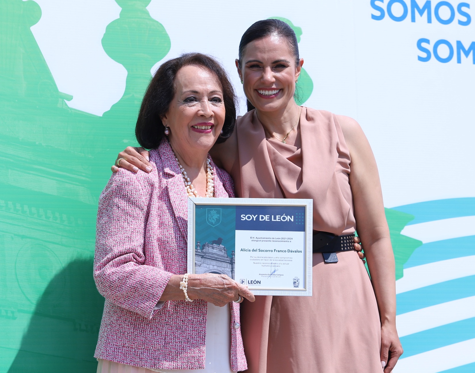 León, Guanajuato a 3 de julio de 2023.- Por su amor al prójimo y servir a quienes más lo necesitan, en especial a personas con discapacidad, la presidenta Ale Gutiérrez, entregó el reconocimiento Soy de León a Alicia del Socorro Franco Dávalos, conocida como ‘Lichita Franco’.