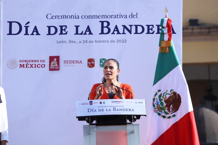 León, Gto., 24 de febrero de 2022.- Durante la ceremonia de conmemoración del Día de la Bandera, la presidenta municipal Ale Gutiérrez hizo un llamado a sentirse orgullosos de ser mexicanos y a construir un mejor futuro.