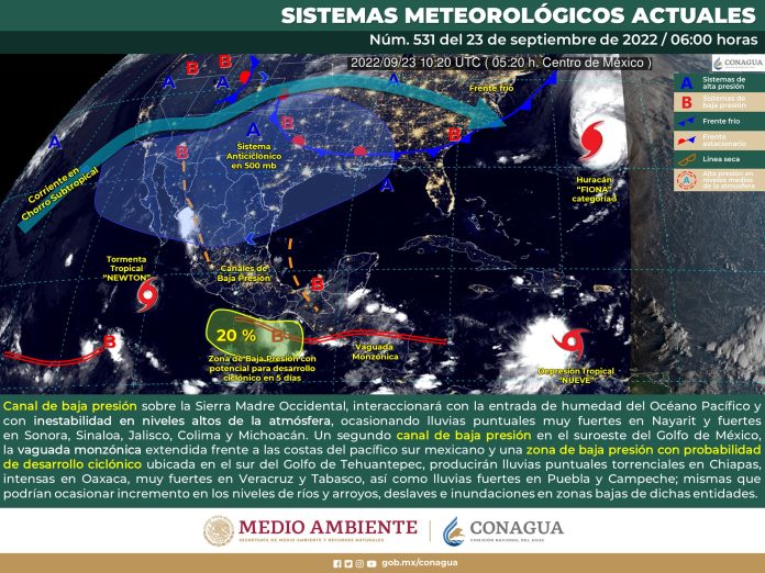 Este viernes, un canal de baja presión se extenderá sobre la Sierra Madre Occidental e interaccionará con la entrada de humedad del Océano Pacífico y con inestabilidad en niveles altos de la atmósfera, ocasionando lluvias puntuales muy fuertes en Nayarit y fuertes en Sonora, Sinaloa, Jalisco, Colima y Michoacán. Un segundo canal de baja presión en el suroeste del Golfo de México, la vaguada monzónica extendida frente a las costas del pacífico sur mexicano y una zona de baja presión con probabilidad de desarrollo ciclónico ubicada en el sur del Golfo de Tehuantepec, producirán lluvias puntuales torrenciales en Chiapas, intensas en Oaxaca, muy fuertes en Veracruz y Tabasco, así como lluvias fuertes en Puebla y Campeche; mismas que podrían ocasionar incremento en los niveles de ríos y arroyos, deslaves e inundaciones en zonas bajas de dichas entidades. Finalmente, se pronostica ambiente vespertino caluroso a muy caluroso con temperaturas máximas superiores a 35°C en zonas de Baja California, Sonora, Chihuahua, Sinaloa, Coahuila, Nuevo León, Tamaulipas y Guerrero.