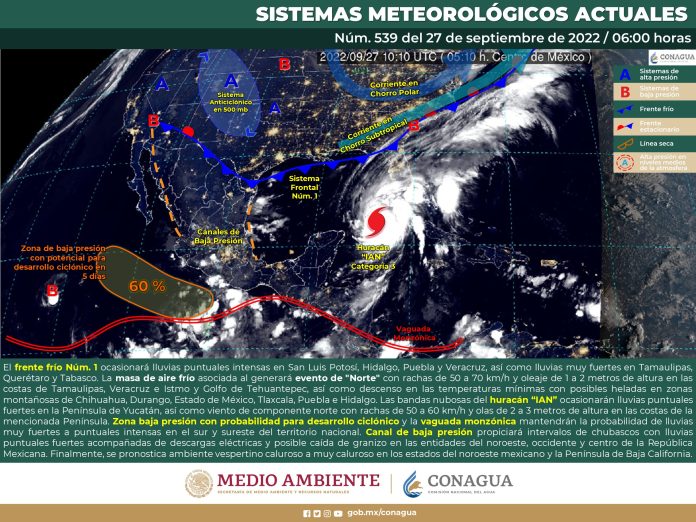 Durante este día, el paso del frente frío Núm. 1 sobre el Golfo de México y oriente del país, ocasionará lluvias puntuales intensas en San Luis Potosí, Hidalgo, Puebla y Veracruz, así como lluvias muy fuertes en Tamaulipas, Querétaro y Tabasco. La masa de aire frío asociada al frente, generará evento de “Norte” con rachas de 50 a 70 km/h en Tamaulipas, Veracruz, Istmo y Golfo de Tehuantepec, oleaje de 1 a 2 metros de altura en las costas de Tamaulipas, Veracruz, Oaxaca y Chiapas, así como descenso en las temperaturas mínimas con posibles heladas en zonas montañosas de Chihuahua, Durango, Estado de México, Tlaxcala, Puebla e Hidalgo. Por su parte, el huracán “Ian”, se desplazará sobre el oriente del Golfo de México ocasionando lluvias puntuales fuertes en la Península de Yucatán, así como viento de componente norte con rachas de 50 a 60 km/h y olas de 2 a 3 metros de altura en las costas de la mencionada Península. Una zona de baja presión con probabilidad para desarrollo ciclónico localizada al sur de las costas de Guerrero y Oaxaca, así como la cercanía de la vaguada monzónica, mantendrán la probabilidad de lluvias muy fuertes a puntuales intensas en el sur y sureste del territorio nacional. Un canal de baja presión que se extenderá sobre el noroeste, occidente y centro de la República Mexicana, propiciarán intervalos de chubascos con lluvias puntuales fuertes acompañadas de descargas eléctricas y posible caída de granizo sobre las entidades mencionadas. Finalmente, se pronostica ambiente vespertino caluroso a muy caluroso en los estados del noroeste mexicano y la Península de Baja California.