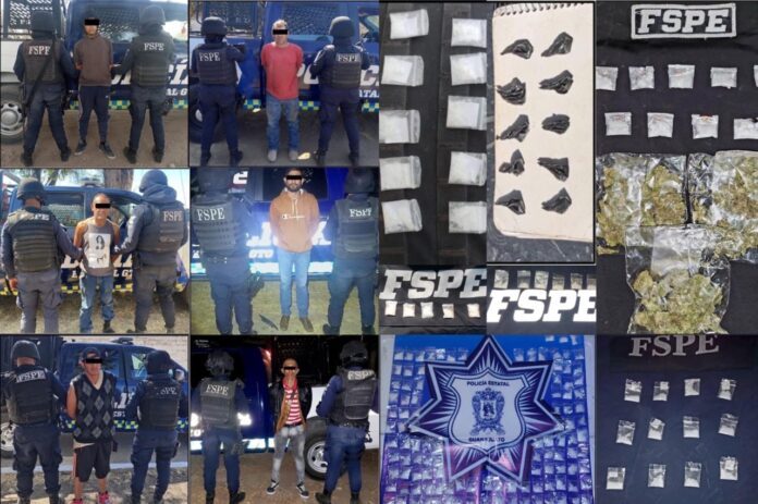 Se aseguró en la colonia San Rafael, en San Miguel de Allende, a una femenina con 42 dosis de drogas sintéticas; en El Caracol, se puso a disposición de la autoridad a un masculino con 456 dosis de drogas sintéticas; en la San Antonio se aseguró y puso a disposición a un masculino con un arma de fuego, 6 cartuchos útiles, un cargador y 43 dosis de drogas sintéticas; y en la comunidad de Pantoja, se logró la detención de un masculino con un arma de fuego de elaboraciòn artesanal, 29 cartuchos útiles y 48 dosis de drogas sintéticas.