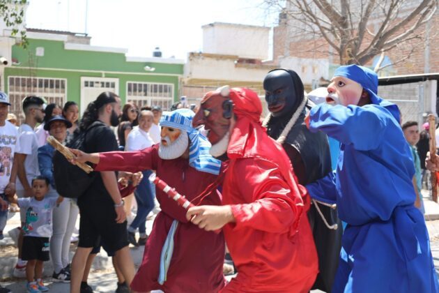 A las 10:59 de la mañana de este Jueves Santo, tambores y chirimía concentraron a los más de 650 personajes participantes de La Judea, los osados comenzaron a provocar a Los Diablos, quienes azotaron sus chicote en la salida de calles H. Bustos y calle 5 de Mayo rumbo al Panteón Municipal.