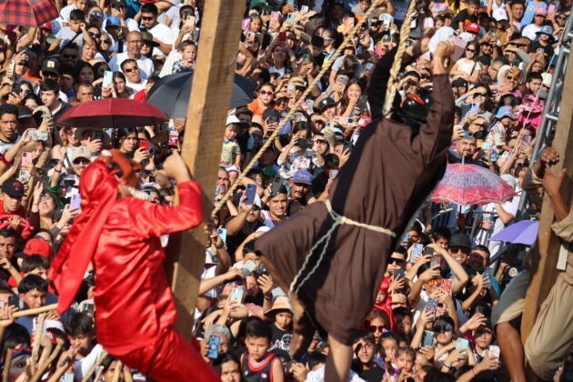 Purísima del Rincón, Gto., 19 de abril de 2025.- El momento de la horca de Judas es el momento más climático de esta centenaria celebración.