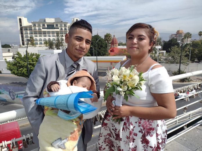 Milagros Barrón y Jorge Antonio Luna, de 22 y 28 años de edad, respectivamente, y vecinos de la colonia Lomas de Medina, fueron otra pareja que también acudieron al puente del amor a sellar su amor acompañados de su hijo y familia, contaron que se conocieron hace cuatro años en una fábrica de zapatos donde trabajaban y de ahí surgió el amor.