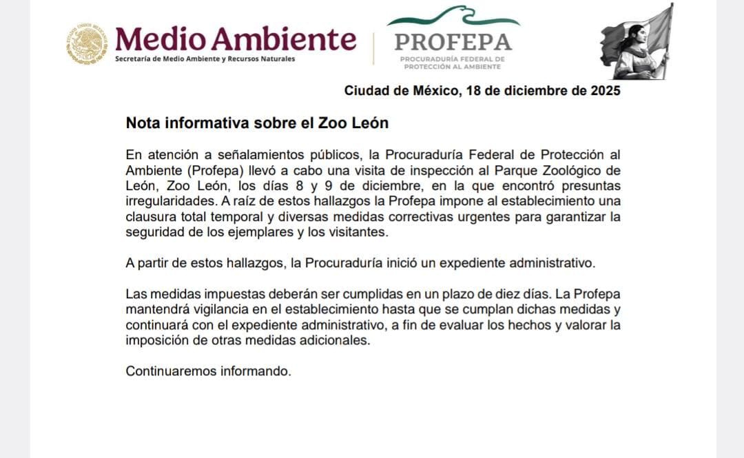“Como parte del procedimiento, la dependencia federal dictó medidas correctivas urgentes que el zoológico deberá cumplir en un plazo máximo de diez días”, dice el comunicado.