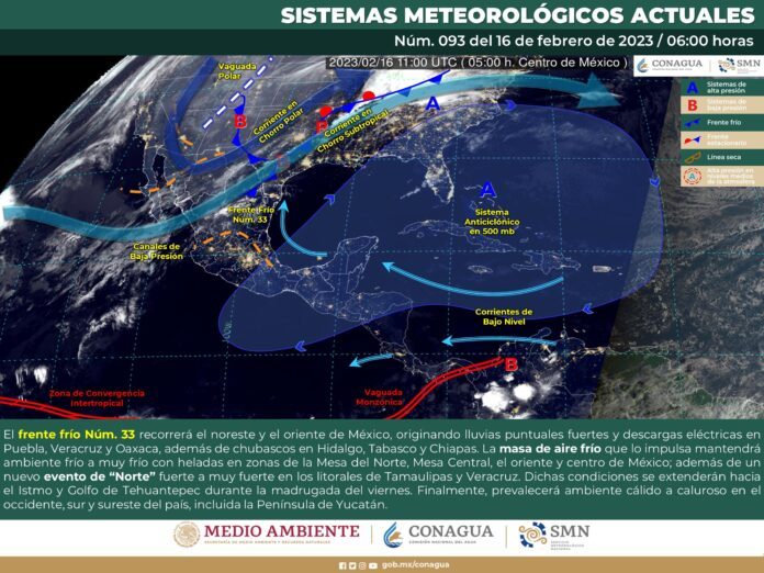 Este día, el frente frío Núm. 33 recorrerá el noreste y el oriente de México, originando lluvias puntuales fuertes y descargas eléctricas en Puebla, Veracruz y Oaxaca, además de chubascos en Hidalgo, Tabasco y Chiapas. La masa de aire frío que lo impulsa mantendrá ambiente frío a muy frío con heladas en zonas de la Mesa del Norte, Mesa Central, el oriente y centro de México; además de un nuevo evento de “Norte” fuerte a muy fuerte en los litorales de Tamaulipas y Veracruz. Dichas condiciones se extenderán hacia el Istmo y Golfo de Tehuantepec durante la madrugada del viernes. Finalmente, prevalecerá ambiente cálido a caluroso en el occidente, sur y sureste del país, incluida la Península de Yucatán.