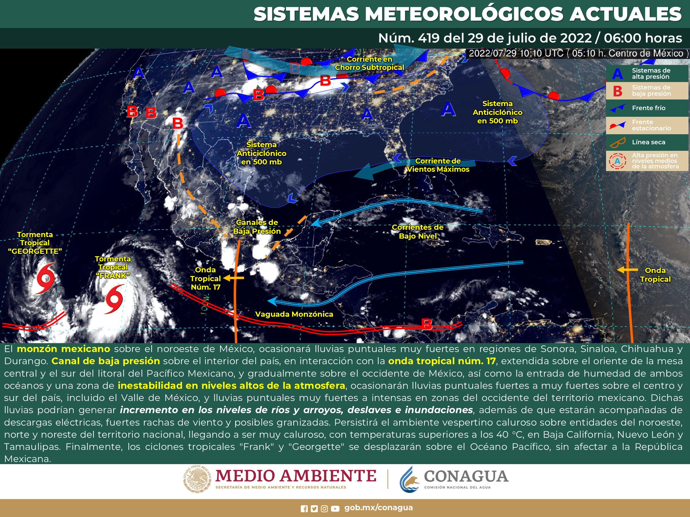 Para hoy, el monzón mexicano sobre el noroeste de México, ocasionará lluvias puntuales muy fuertes en regiones de Sonora, Sinaloa, Chihuahua y Durango. Por su parte, un canal de baja presión sobre el interior del país, en interacción con el desplazamiento de la onda tropical núm. 17, extendida sobre el oriente de la mesa central y el sur del litoral del Pacífico Mexicano y gradualmente sobre el occidente de México, así como la entrada de humedad de ambos océanos y una zona de inestabilidad en niveles altos de la atmósfera, ocasionarán lluvias puntuales fuertes a muy fuertes sobre el centro y sur del país, incluido el Valle de México, y lluvias puntuales muy fuertes a intensas en zonas del occidente del territorio mexicano. Dichas lluvias podrían generar incremento en los niveles de ríos y arroyos, deslaves e inundaciones, además de que estarán acompañadas de descargas eléctricas, fuertes rachas de viento y posibles granizadas. Nuevamente persistirá el ambiente vespertino caluroso sobre entidades del noroeste, norte y noreste del territorio nacional, llegando a ser muy caluroso, con temperaturas superiores a los 40 °C, en Baja California, Nuevo León y Tamaulipas. Finalmente, los ciclones tropicales “Frank” y “Georgette” se desplazan sobre el Océano Pacífico, sin afectar a la República Mexicana.