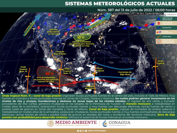 Para hoy, la onda tropical Núm. 11 recorrerá el sur del litoral del Pacífico y el sur de la Mesa Central, e interaccionará con un canal de baja presión sobre Chiapas y Oaxaca, lo que originará lluvias puntuales fuertes en el centro del país, incluido el Valle de México y muy fuertes en Guerrero, así como lluvias puntuales intensas en zonas de Chiapas, Oaxaca y Veracruz, las cuales podrían generar incremento en los niveles de ríos y arroyos, inundaciones y deslaves en zonas bajas de los citados Estados. El ingreso de aire cálido y húmedo procedente del Mar Caribe, generará chubascos en los Estados de la Península de Yucatán. Por su parte, el monzón mexicano sobre el noroeste del territorio nacional y su combinación con inestabilidad en niveles altos de la atmósfera, ocasionarán lluvias puntuales fuertes a muy fuertes con descargas eléctricas, rachas fuertes de viento y posible caída de granizo en zonas del noroeste y norte de México. A su vez, un canal de baja presión en el interior del país, el ingreso de humedad de ambos océanos e inestabilidad en niveles altos de la atmósfera, producirán chubascos y lluvias puntuales fuertes a muy fuertes, las cuales estarán acompañadas de descargas eléctricas, rachas fuertes de viento y posible caída de granizo en Estados del norte y occidente del territorio mexicano. Asimismo, persistirá el ambiente cálido a caluroso en gran parte del país, con temperaturas vespertinas muy calurosas, superiores a los 40°C en Sinaloa, Chihuahua, Coahuila, Nuevo León y Tamaulipas, así como temperaturas máximas extremadamente calurosas que podrían superar los 45°C en zonas de Baja California y Sonora. Finalmente, una zona de baja presión con probabilidad para desarrollo ciclónico al sur de las costas de Chiapas, favorecerá abundante ingreso de humedad, reforzando el potencial de lluvias intensas en el sureste mexicano.