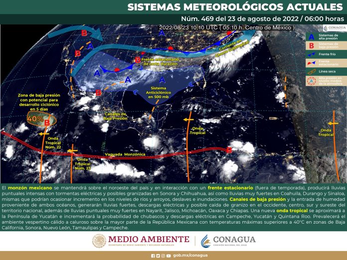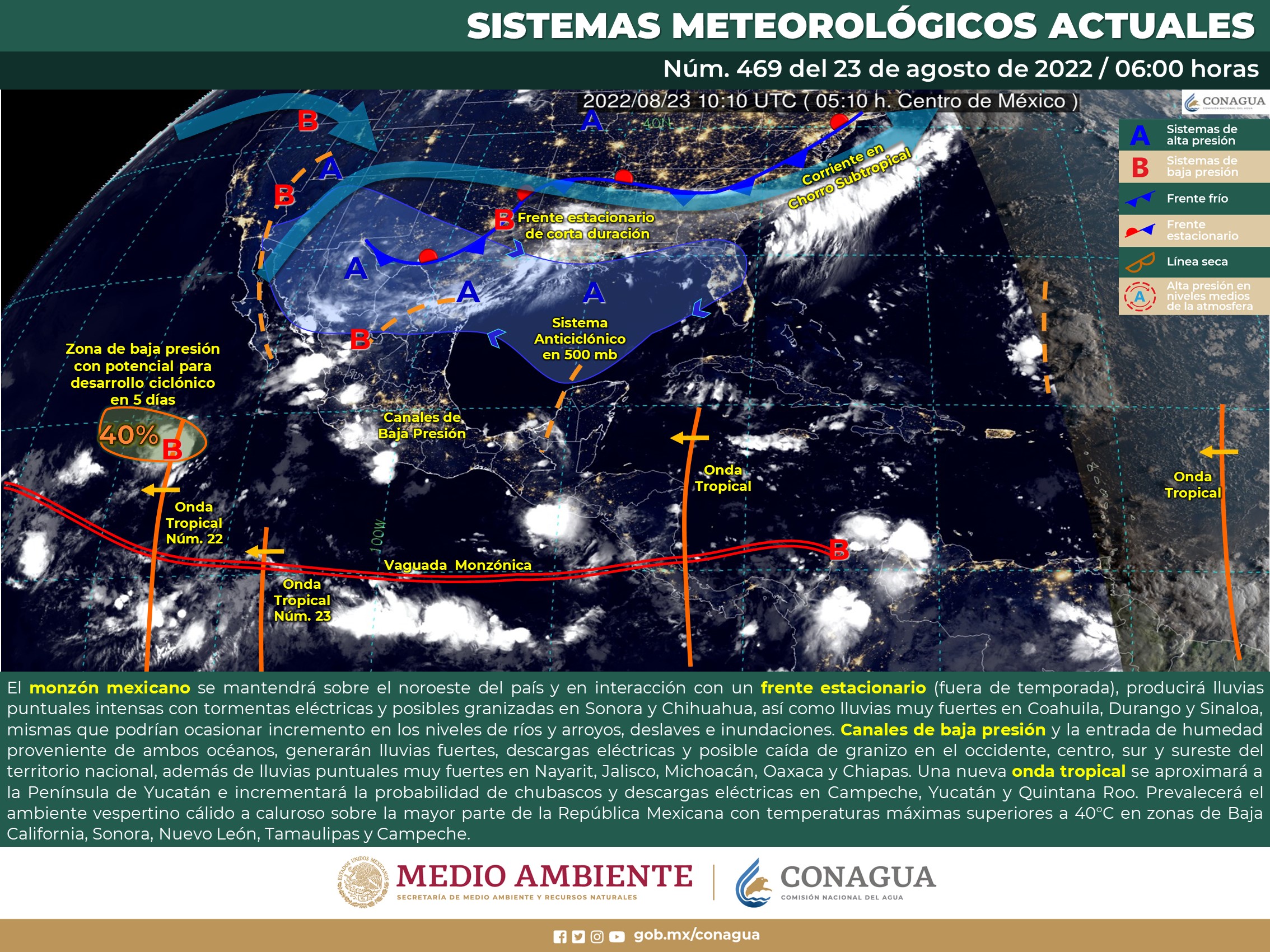 Este día, el monzón mexicano se mantendrá sobre el noroeste del país, en interacción con un frente estacionario (fuera de temporada) en el norte de México, producirá lluvias puntuales intensas con tormentas eléctricas y posibles granizadas en Sonora y Chihuahua, así como lluvias muy fuertes en Coahuila, Durango y Sinaloa, mismas que podrían ocasionar incremento en los niveles de ríos y arroyos, deslaves e inundaciones. Canales de baja presión y la entrada de humedad proveniente de ambos océanos, generarán lluvias fuertes, descargas eléctricas y posible caída de granizo en el occidente, centro, sur y sureste del territorio nacional, además de lluvias puntuales muy fuertes en Nayarit, Jalisco, Michoacán, Oaxaca y Chiapas. Una nueva onda tropical se aproximará a la Península de Yucatán e incrementará la probabilidad de chubascos y descargas eléctricas en Campeche, Yucatán y Quintana Roo. Finalmente, prevalecerá el ambiente vespertino cálido a caluroso sobre la mayor parte de la República Mexicana con temperaturas máximas superiores a 40°C en zonas de Baja California, Sonora, Nuevo León, Tamaulipas y Campeche.